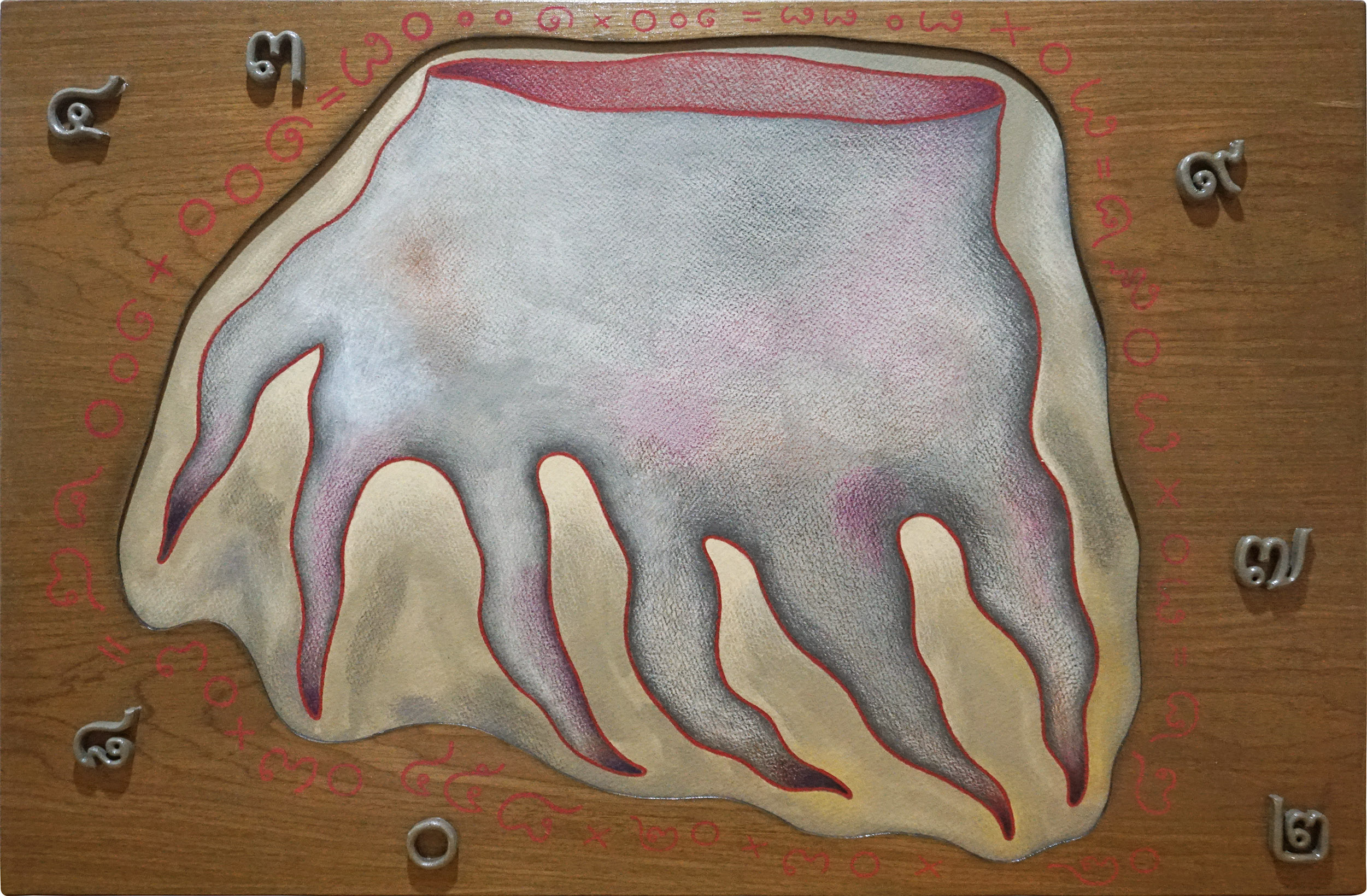 paper maché of of Thai lottery ticket, pencil color on wood 50 x 50 cm, 2019